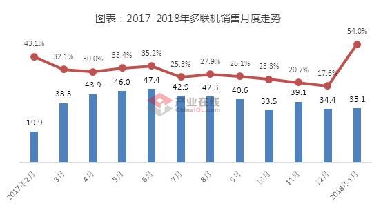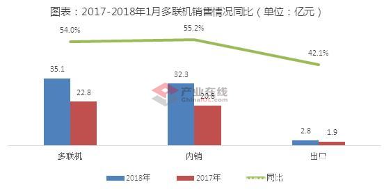 据产业在线监测数据显示,2018年1月多联机销售额为35.1亿元,同比增长54.0%。多联机内销额为32.3亿元,同比增长55.2%。其中变频多联机内销额为32.3亿元,同比增长55.2%,数码和定速多联机内销额持续下滑。1月多联机出口也实现了较高的增长,出口金额为2.8亿元,同比增长42.1%。