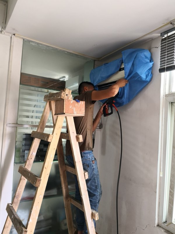 师傅正在清洗空调内机,用空调罩将内机罩住免得水流出到办公室里。
